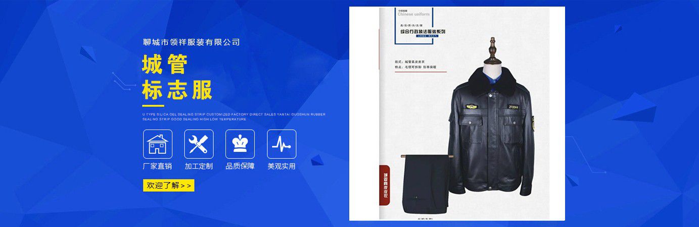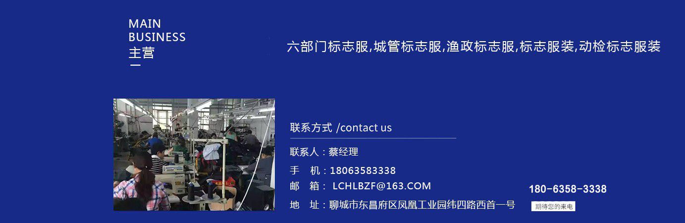 聊城市領祥服裝有限公司主主要生產六部門標志服,城管標志服,漁政標志服,標志服裝,動檢標志服裝,標志服裝廠等產品,款式新穎,做工精細,可根據用戶要求批量定做。公司成立以來,已為各行業數千家企業、集團承制了職業制服。 多年來,我公司本著“質優高效,守約重譽”的經營理念給廣大新老客戶提供質優價廉的產品和售后服務。憑借良好的信譽,雄厚的實力,優質的產品,低廉的價格愿與新老客戶真誠協作,業務遍布全國各地,是山東優秀的標志服裝廠,歡迎新老客戶參觀考察!  公司生產的職業服飾均以標準的質量,頂尖精湛的技術為基礎,以客戶的滿意為根本,全程采用電腦輔助設計制服,成衣、服飾配件(領帶,領結,紐扣,帽子,企業標志等)均可定織定染,普遍采用進口或合資優質輔料,尺碼按身高和體型劃分或量體定制。每一道工序,每一個生產環節精雕細琢,充分體現了以質量求生存,以信譽求發展的理念。并以準確的市場定位,先進的營銷理念,贏得廣大客戶的信賴支持!  公司宗旨:“團結、服務、創新”。公司方針:“專業創造輝煌,質量保證未來,用心換得人心”。熱誠歡迎業界同仁來公司洽談!...